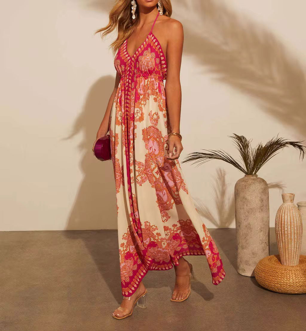Turn heads with this stunning Bohemian Print Maxi Dress, a perfect blend of elegance and effortless charm. Featuring a deep V-neckline, spaghetti straps, and a flattering empire waist, this dress flows beautifully with every step. The vibrant pink and orange ethnic print on a cream base adds a playful yet sophisticated touch, making it ideal for beach vacations, brunches, or summer getaways.