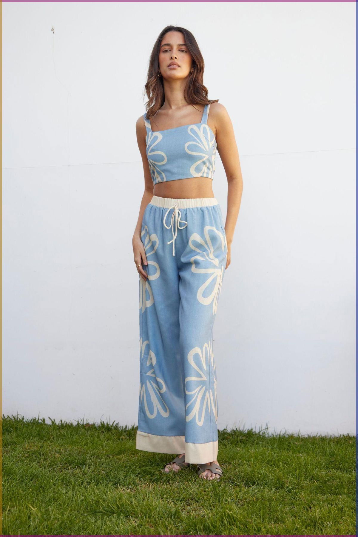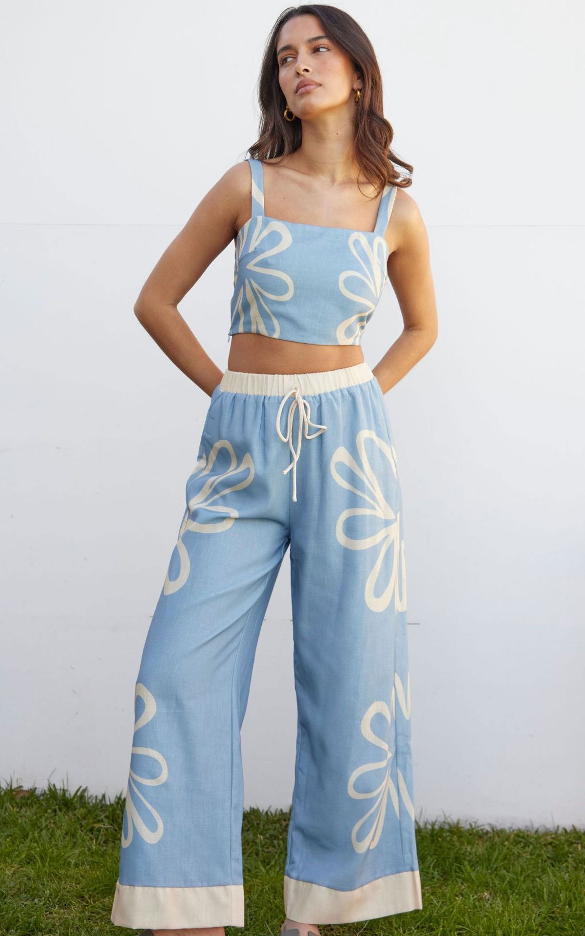 Add a burst of charm to your wardrobe with this trendy blue floral co-ord set. Featuring a square-neck crop top with wide straps and matching high-waist wide-leg pants, this set is perfect for sunny days and casual outings. The eye-catching oversized white floral print gives it a playful yet elegant look, while the drawstring waistband ensures all-day comfort.