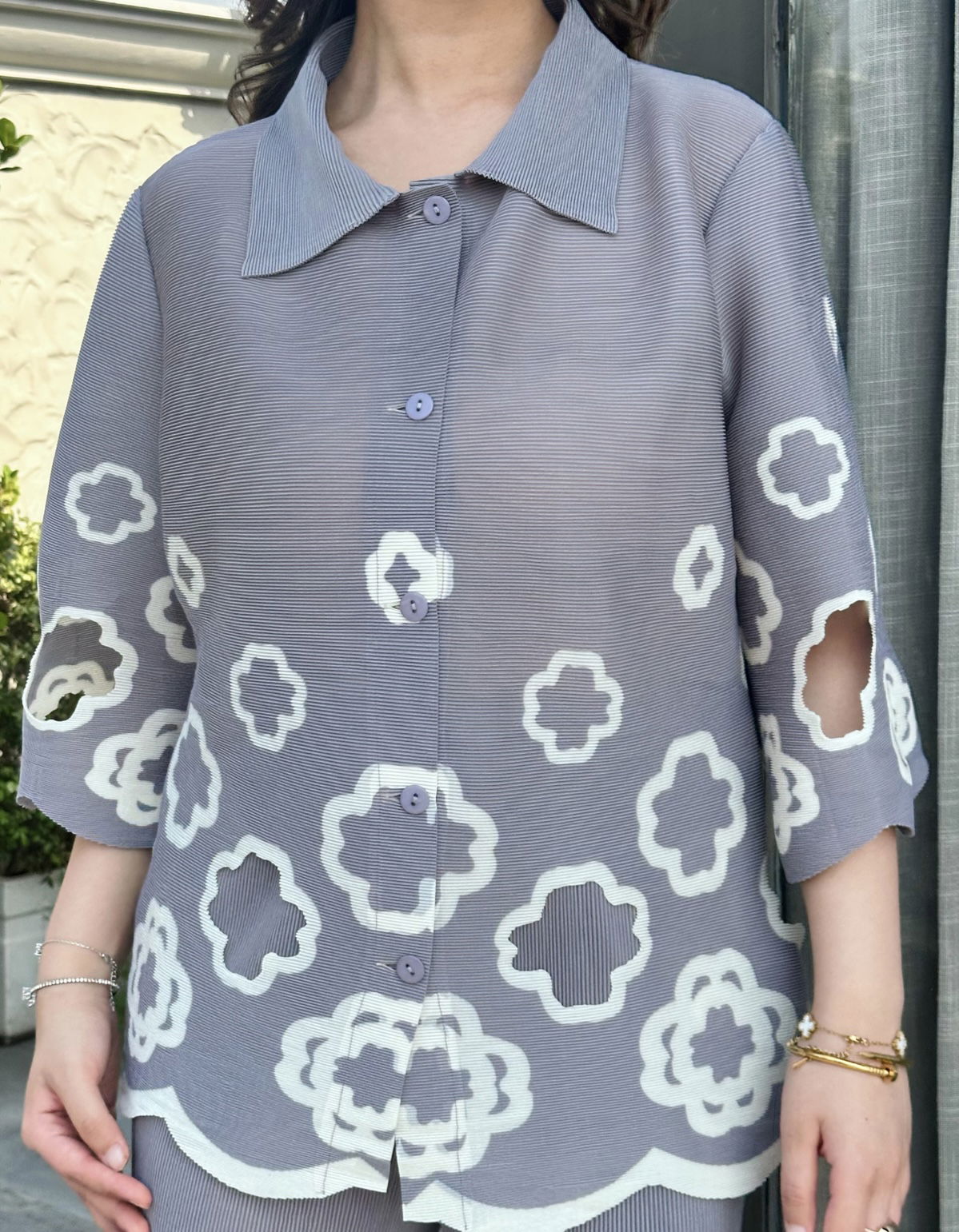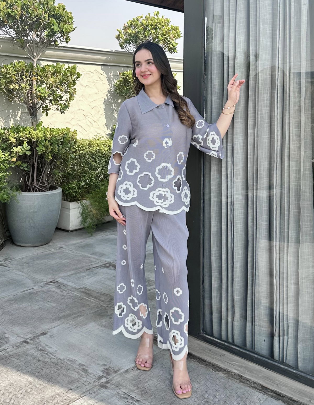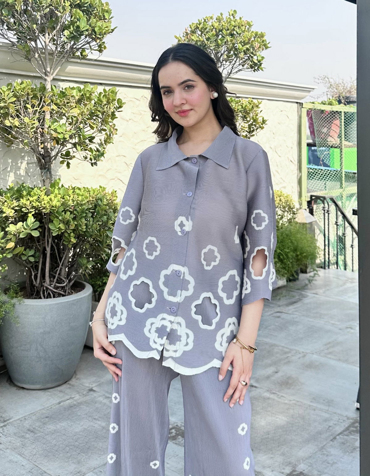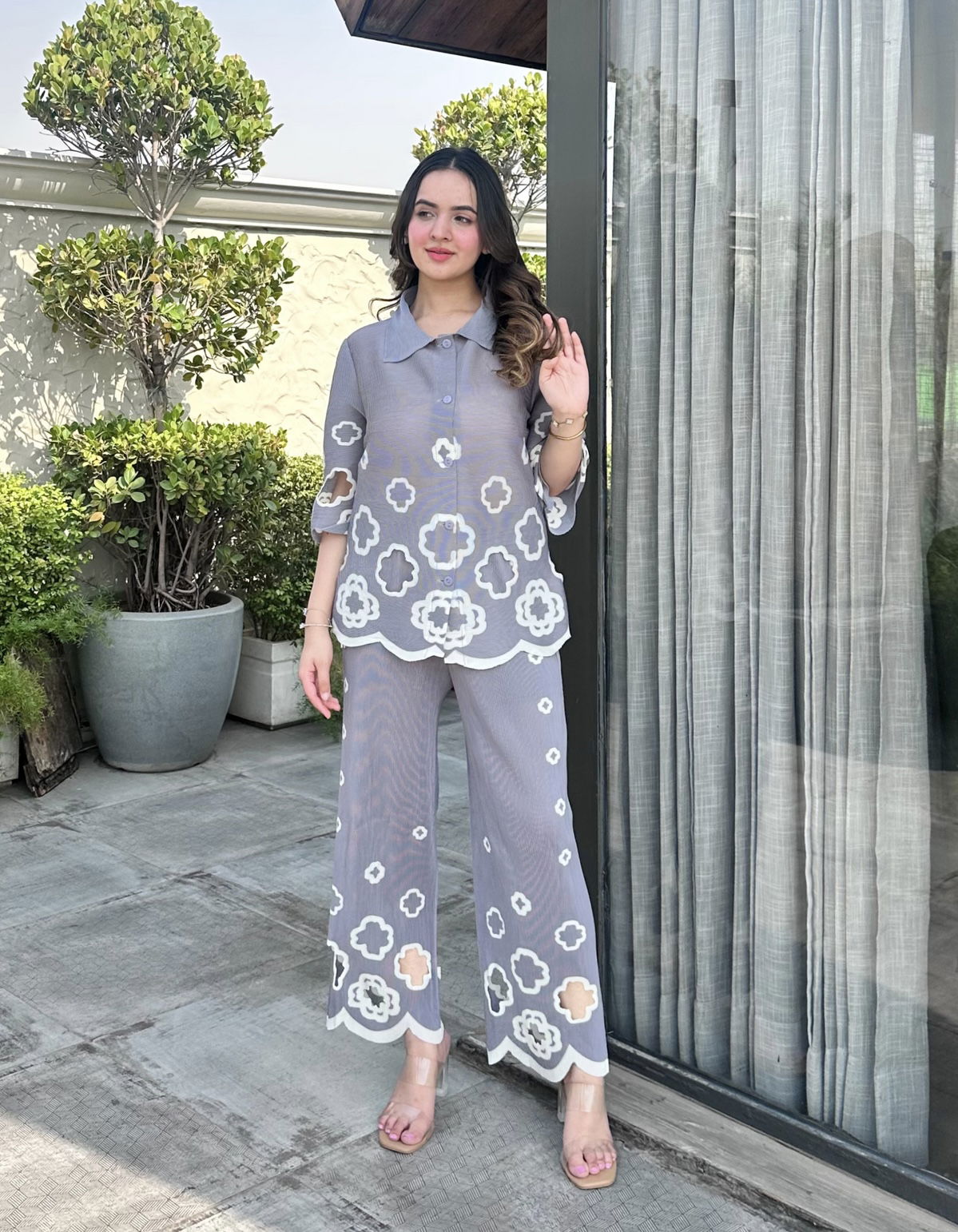 Make a statement with effortless grace in this Grey Floral Cutwork Co-ord Set. Crafted in soft, breathable fabric, this two-piece set features a relaxed-fit top with collar and button detailing, and matching wide-leg pants. The unique floral cut-out embroidery along the hemline and sleeves adds an artistic flair and playful sophistication.