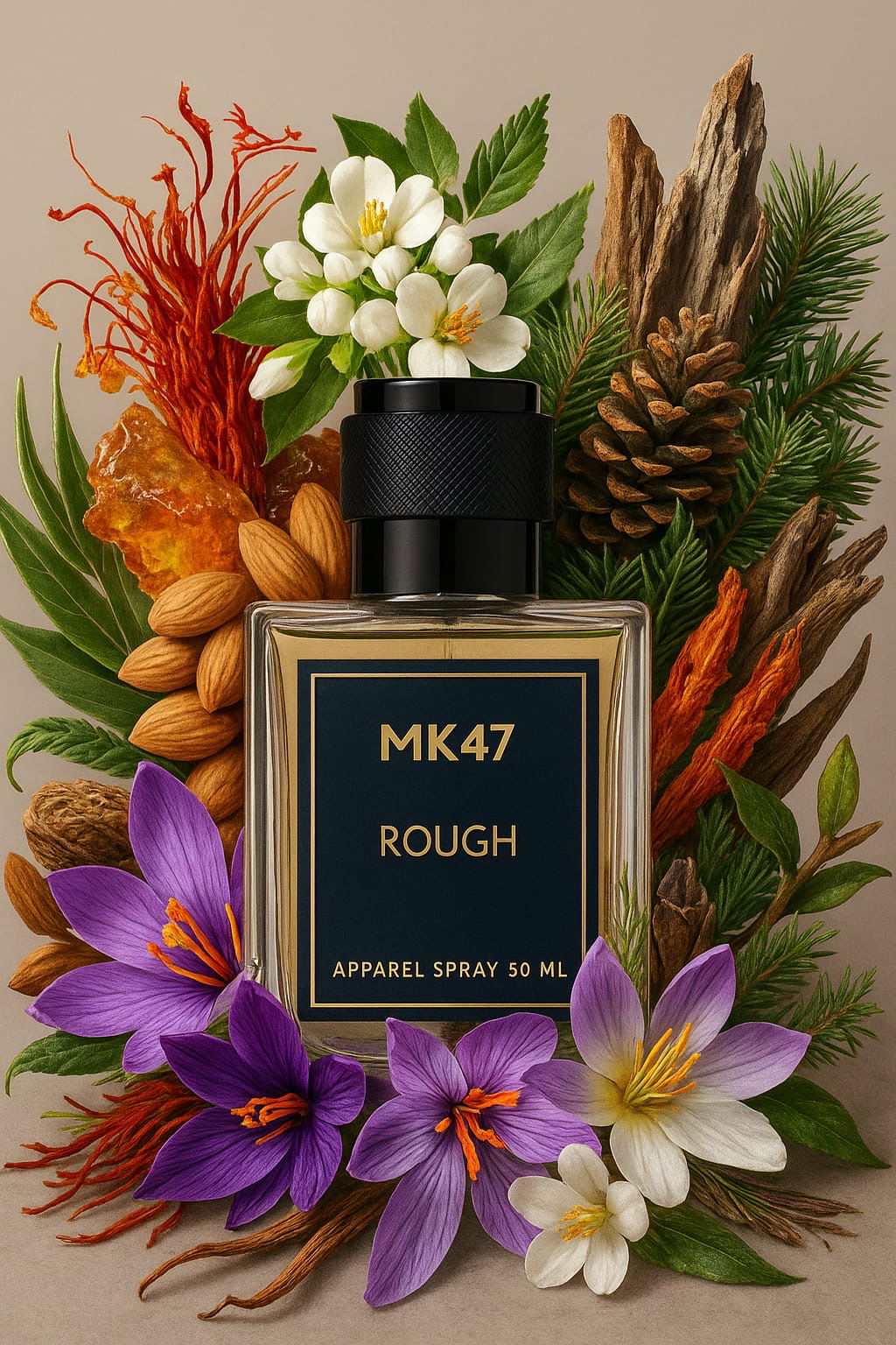 Unleash your bold side with MK47 ROUGH, a premium apparel spray crafted for those who dare to stand out. Infused with the earthy richness of almonds, the freshness of pine, and the soft floral touch of jasmine and saffron, this 50 ml fragrance offers a perfectly balanced blend of rugged charm and refined elegance. Ideal for daily wear or special occasions, this long-lasting scent elevates your presence with every spray.