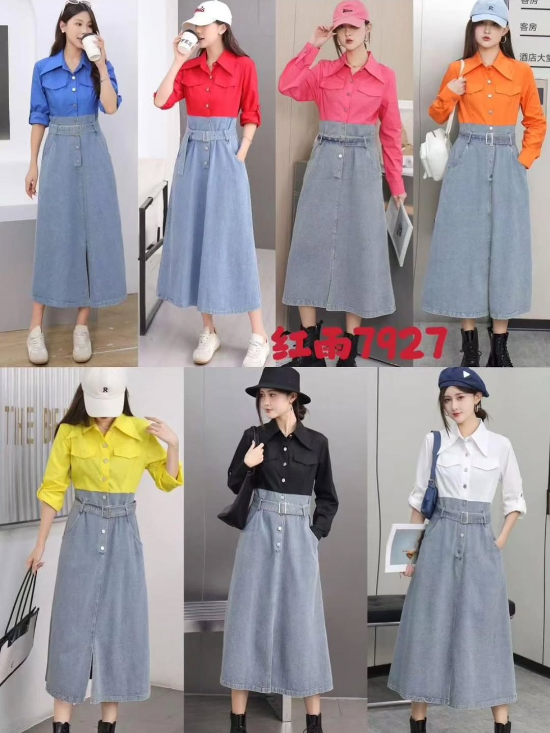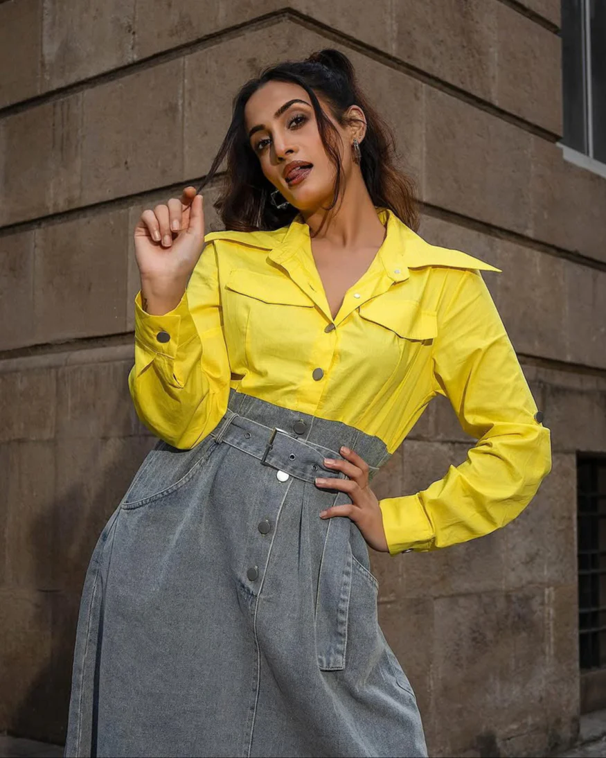 Step into street-style chic with this Yellow Shirt & Denim Skirt style Dress. The outfit pairs a vibrant yellow button-down shirt with a high-waisted, belted denim midi skirt, creating a bold yet balanced contrast. The shirt features flap pockets and structured cuffs, adding utility vibes, while the skirt cinches at the waist for a flattering silhouette.