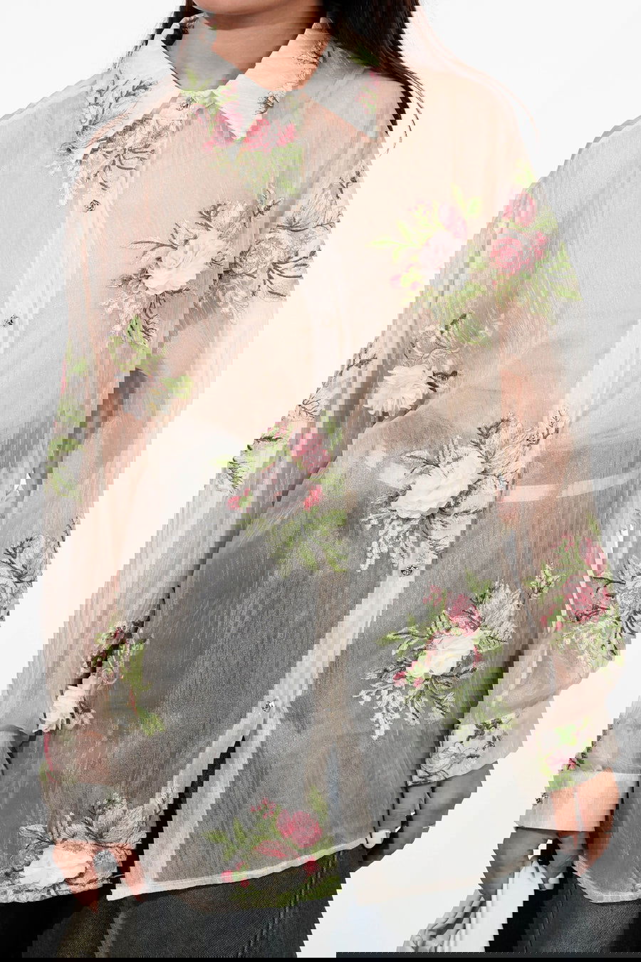 Elevate your elegance with this stunning sheer organza shirt, featuring intricate 3D floral embroidery in soft shades of pink, white, and green. The delicate translucent fabric adds a feminine charm, while the floral patterns on the sleeves, collar, and body make it a true statement piece.