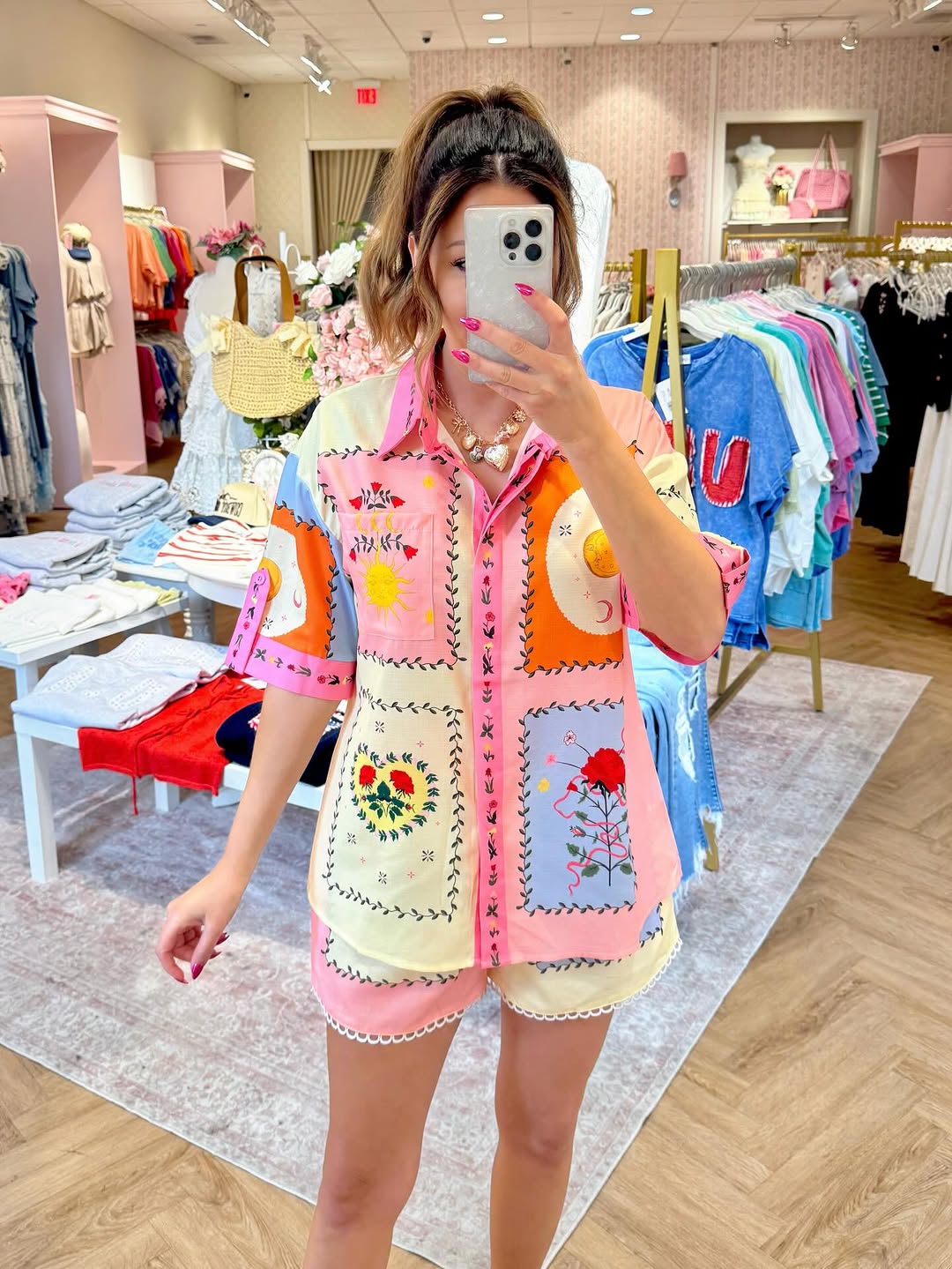 Make a playful statement with this vibrant two-piece co-ord set featuring a patchwork-inspired design. The short-sleeve shirt and high-waist shorts are adorned with charming embroidered-style prints including florals, suns, and birds — bringing a fun, artistic vibe to your look. Crafted from soft, breathable fabric for all-day comfort.