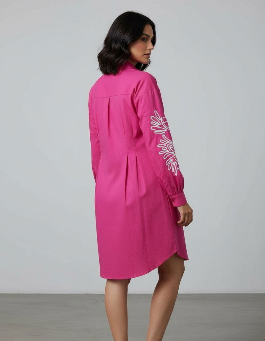 Elevate your wardrobe with this stunning shirt dress, blending casual chic with a touch of elegance. Crafted from premium, breathable fabric, it features a classic collared neckline, long sleeves with intricate white embroidered motifs for a playful pop, and a flattering pleated skirt that sways beautifully with every step. The midi length offers versatile styling—pair it with heels for office or events, or sneakers for a relaxed vibe.