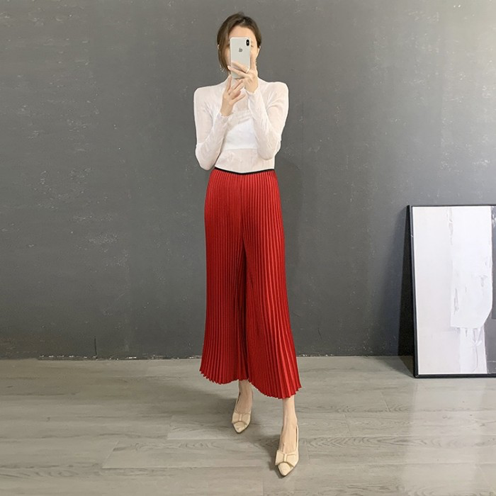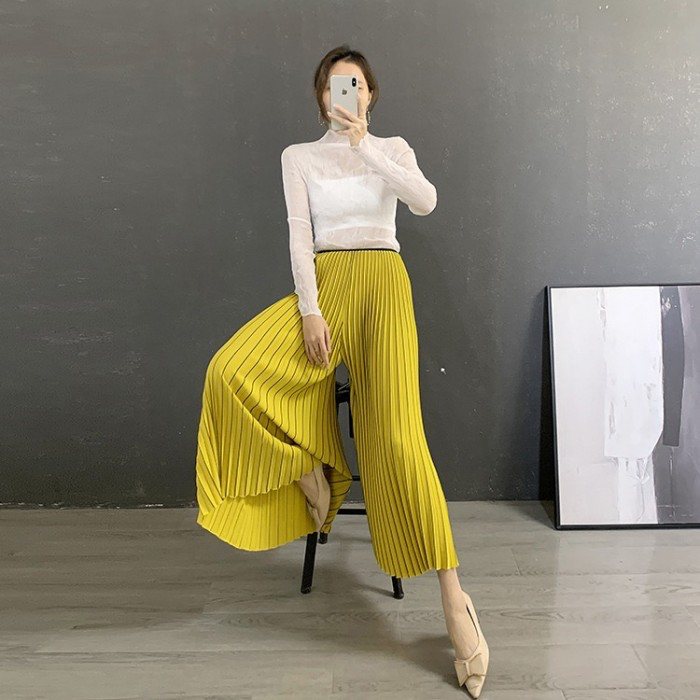 Add a pop of sunshine to your wardrobe with these Pleated Pants. Designed with a high waist and wide-leg silhouette, these pants offer a perfect blend of comfort and style. The knife pleats create a graceful flow and add a structured elegance to your movement. Made from a lightweight, breathable fabric, they are ideal for both casual outings and chic events.